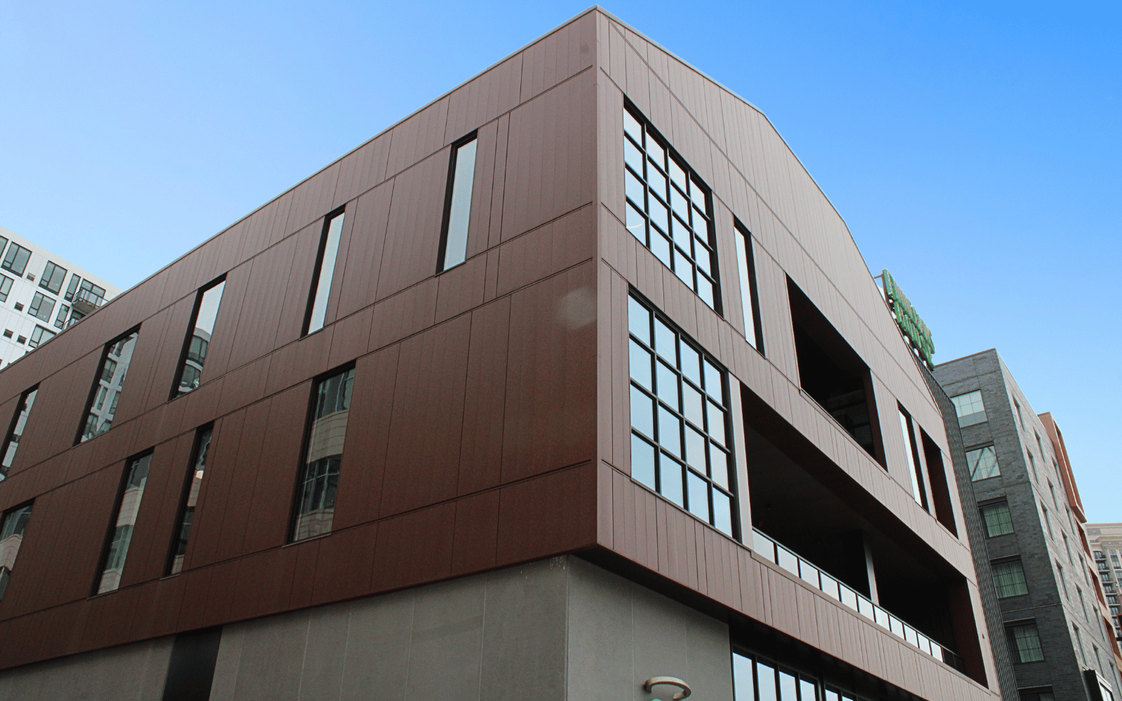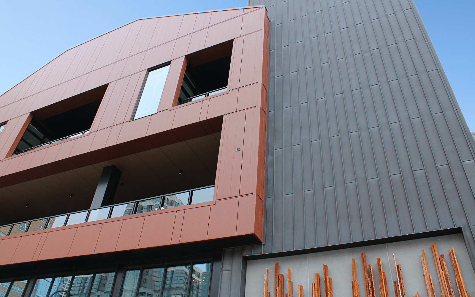M3Sixty provided 177 rolls (13,275 Linear Feet) of 3M Through Wall Flashing Tape. 3,465 square feet on Hunter Xci Ply, an energy efficient rigid insulation panel. And 4,800 square feet of VMZINC North America Anthra Zinc metal panels.
